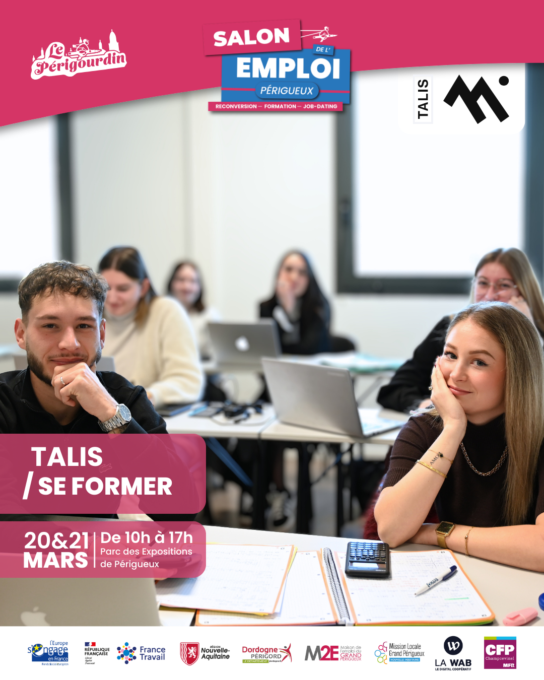 Les 21 et 22 mars 2026, retrouvez Talis au Salon de l’Emploi de Périgueux, au Parc des Expositions, pôle “Se Former”.
