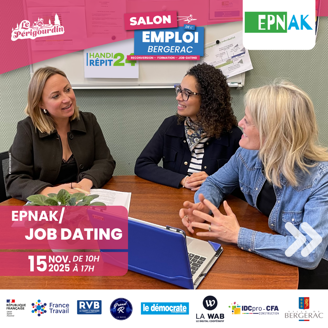 Venez découvrir toutes les opportunités de postes disponibles et poser vos questions à l’équipe de l’EPNAK au Salon de l’Emploi de Bergerac, le samedi 15 novembre à l’Espace Étincelle.