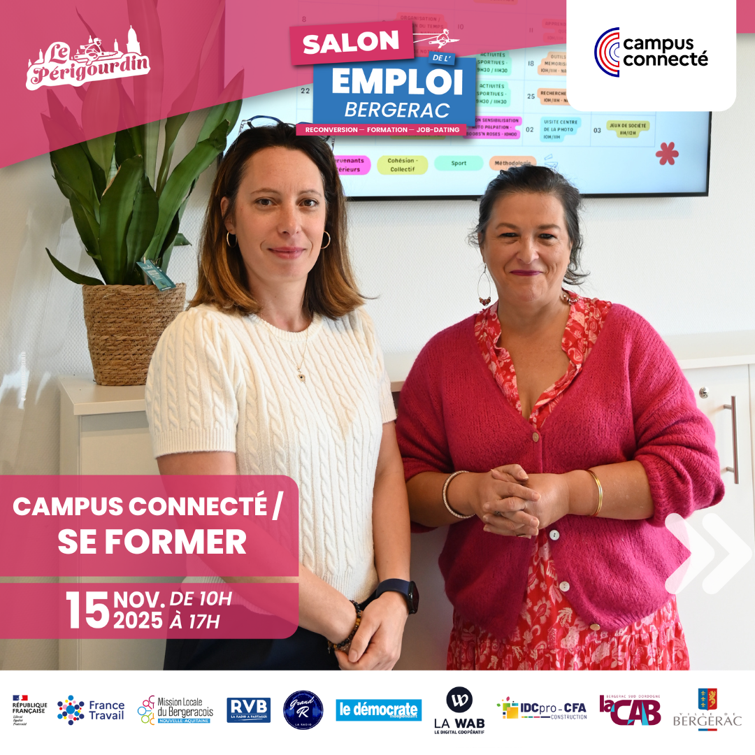 Venez les rencontrer au Salon de l’Emploi de Bergerac !Le 15 novembre, sur l’espace “Se Former”, l’équipe du Campus Connecté vous accueillera pour répondre à vos questions, vous présenter le dispositif et vous guider vers votre avenir.