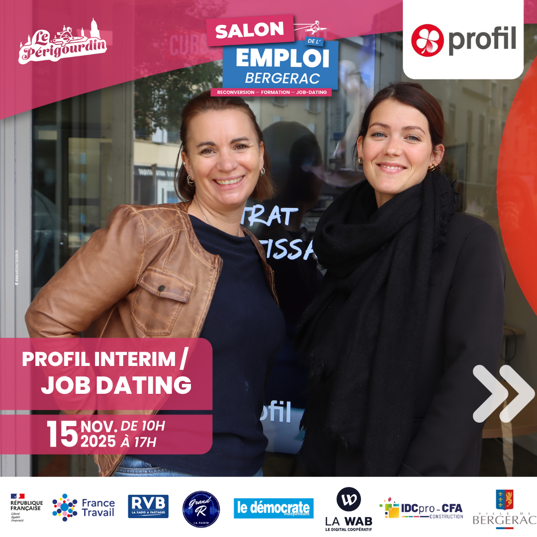 Le 15 novembre 2025, à l’Espace L’Étincelle, Profil Intérim sera présent au Salon de l’Emploi de Bergerac sur la partie Job Dating, pour rencontrer candidats et entreprises et proposer des missions adaptées. Magalie et Camille, expertes de l’agence, seront sur place pour échanger avec les intérimaires et répondre à toutes leurs questions.