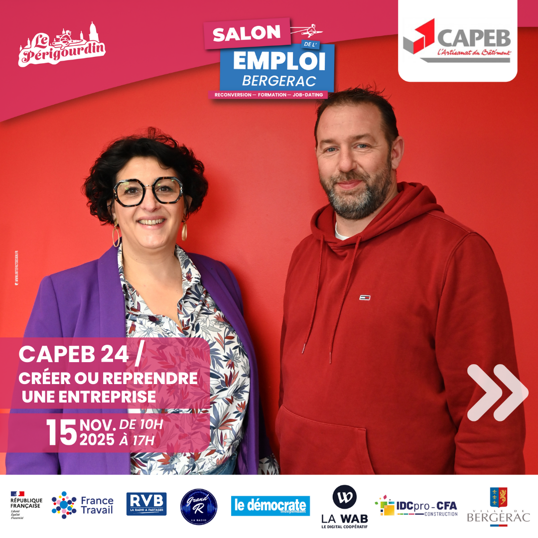 Ne laissez pas votre projet au stade de l’idée ! Le 15 novembre 2025 à Bergerac, profitez du Salon de l’Emploi pour rencontrer la CAPEB Dordogne et découvrir comment Cré.Art.Bât® peut concrétiser votre rêve entrepreneurial.👉 Inscrivez-vous gratuitement dès maintenant !