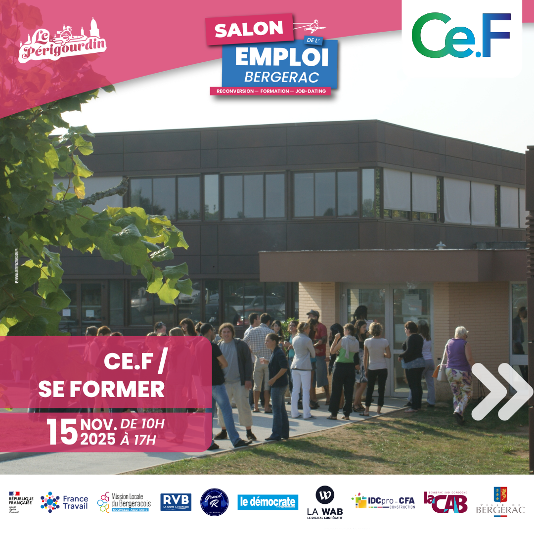 Le 15 novembre 2025 à Bergerac, ne manquez pas le Salon de l’Emploi ! Venez échanger avec les formateurs du Ce.F, découvrir leurs formations et définir plus clairement votre futur professionnel. C’est l’occasion idéale pour poser vos questions, explorer les différents parcours possibles et saisir de nouvelles opportunités pour dynamiser votre carrière.