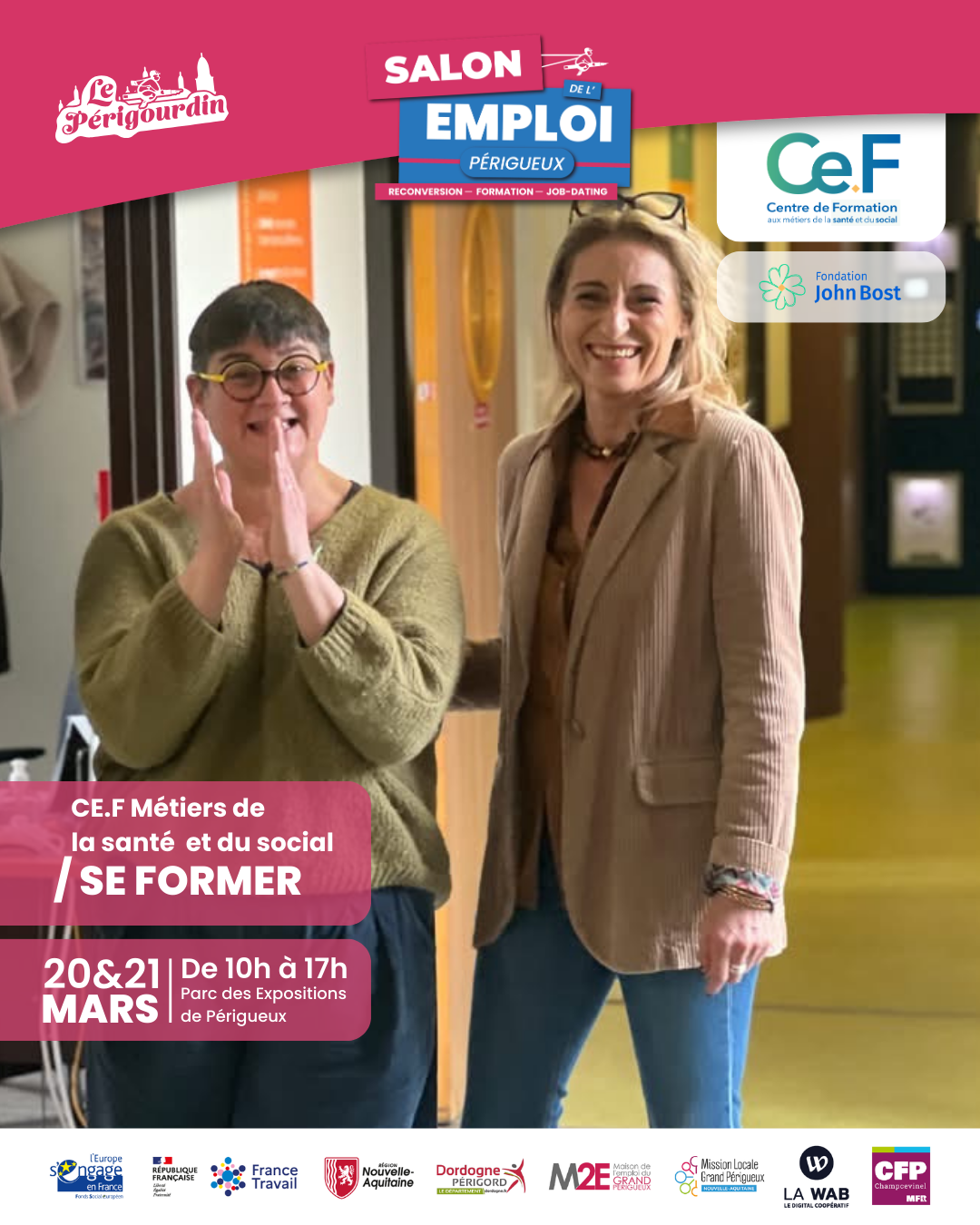 Les 20 et 21 mars, venez au Salon de l’Emploi de Périgueux et retrouvez le Ce.F, le Centre de Formation de la Fondation John BOST, sur le pôle « Se Former » pour découvrir les métiers sanitaires, sociaux et médico-sociaux.