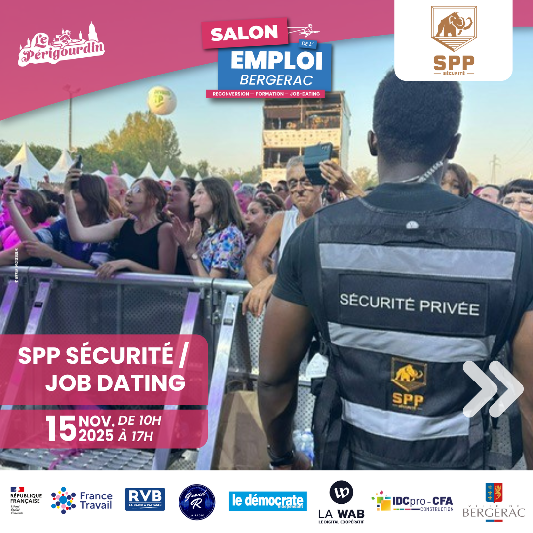 Vous cherchez un métier dynamique et valorisant dans la sécurité ? SPP Sécurité sera présent au Salon de l’Emploi, le samedi 15 novembre à l’Espace Étincelle à Bergerac, pour rencontrer des candidats motivés et proposer plusieurs postes en sécurité privée et publique.