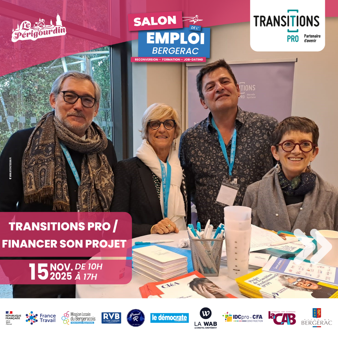 Ne manquez pas cette occasion unique : retrouvez Transitions Pro Nouvelle-Aquitaine au Salon de l’Emploi, de la Reconversion et de la Formation, samedi 15 novembre à l’Espace Étincelle à Bergerac.