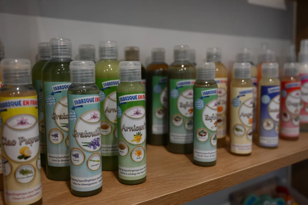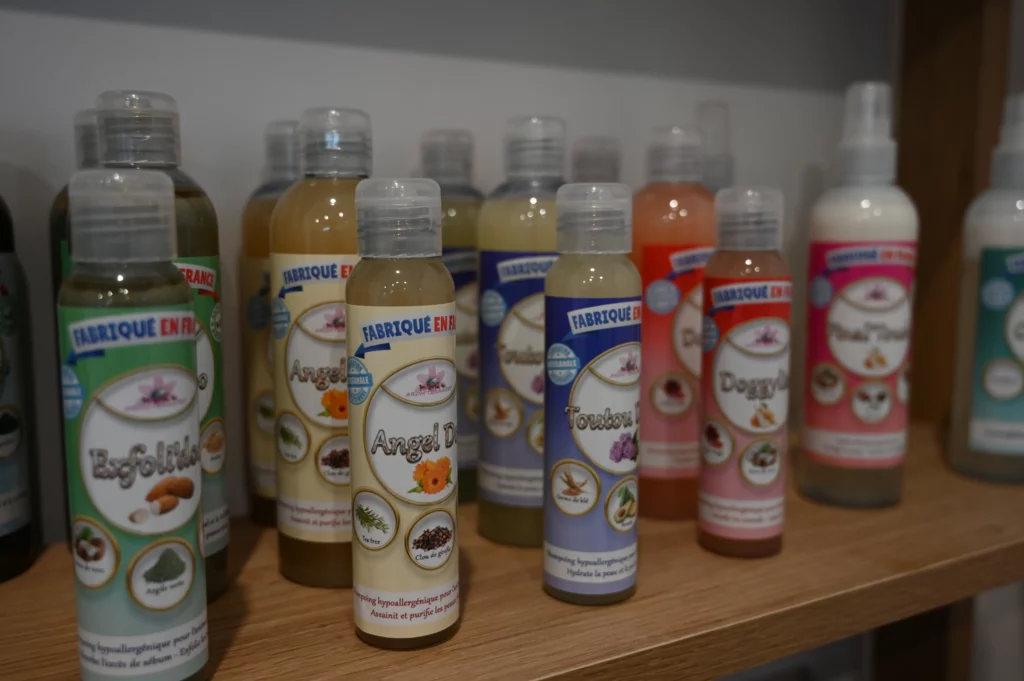 Samantha utilise uniquement des produits naturels certifiés One Voice, dont la marque Nath Di Bella, reconnue pour ses formules respectueuses des animaux et de l’environnement. Les shampoings peuvent aussi être mélangés pour s’adapter aux besoins de chaque animal.